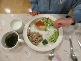 園のブログ 給食の様子 2026年2月25日(水) ゆり組 2月17日(火)の給食の様子です。 ・ロールパン ・ワカメスープ ・鶏肉のアップルソースかけ ・シーザーサラダ こぼさずに、上手に食べられるよ(*'▽') もどる