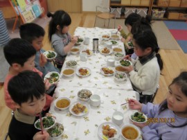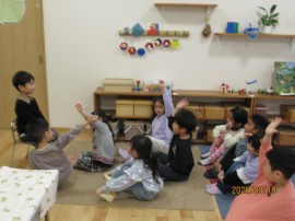 手遊びをしたり、クイズを出し合ったりして、給食の準備が整うのを待ちます。 |