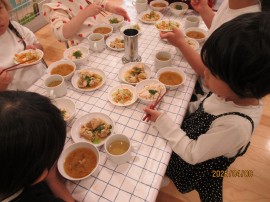 お友だちと食卓をかこんでの給食、楽しい時間です。 |